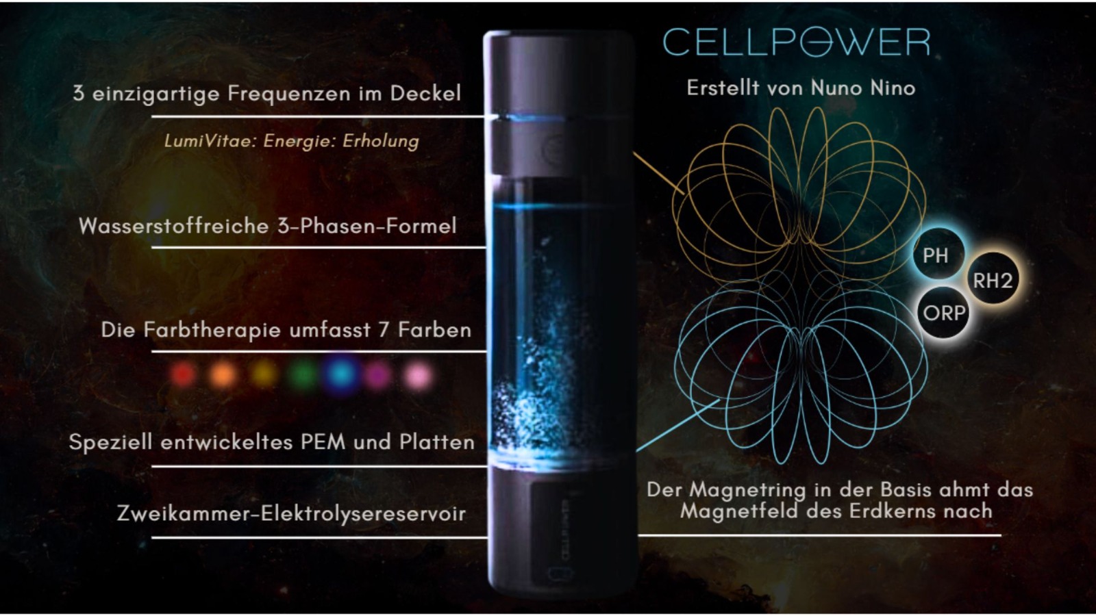 Im Deckel sind drei Frequenzen integriert: Energy, Recovery, und Lumivitae. Der Behälter besteht aus medizinischem Tritan und fasst 3 dl. Die weltbeste PEM-Membran sorgt für die Herstellung von molekularem Wasserstoff in therapeutischer Form. Ein Magnetring im Boden imitiert das Erdmagnetfeld, und eine Chromotherapie bietet sieben Chakrafarben zur Auswahl.