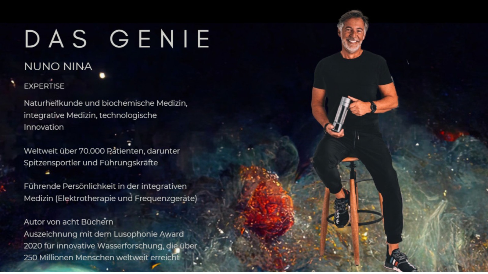 Jetzt bestellen (ab Juli in Europa)Lumivitae heisst "Licht des Lebens". Es ist ein Wasserstoffgenerator, welcher molekularen Wasserstoff in der reinsten Form und in einer therapeutischen Menge herstellt. Das Gerät stellt antikes Wasser her, wie der Ursprung unseres Wassers war. Nuno Nina, der Erfinder, bringt alle Naturgesetze wieder ins Wasser, damit wir körperlich, seelisch und geistig ins Gleichgewicht kommen. Lumivitae Cellpower wurde geprüft auf 7 Jahre Nutzungsdauer. Ohne Wartung, ohne Filterwechsel, 2 Jahre Garantie auf Herstellungsfehler.
